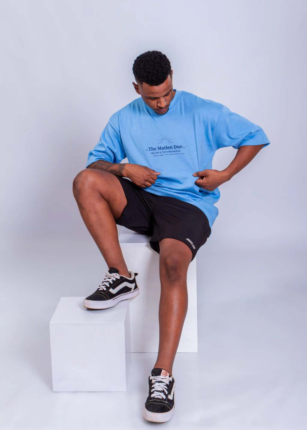 O segredo da Oversized SKY é a combinação de cores. Para um look minimalista e equilibrado, combine-a com peças de baixo neutras, como o Short Training Clássic Matlen em Preto ou uma Calça Slim de Tricot em Bege. Para criar um color block moderno (o toque divertido no ponto!), use-a com bermudas em tons contrastantes. Finalize com tênis brancos minimalistas para manter a leveza do céu.